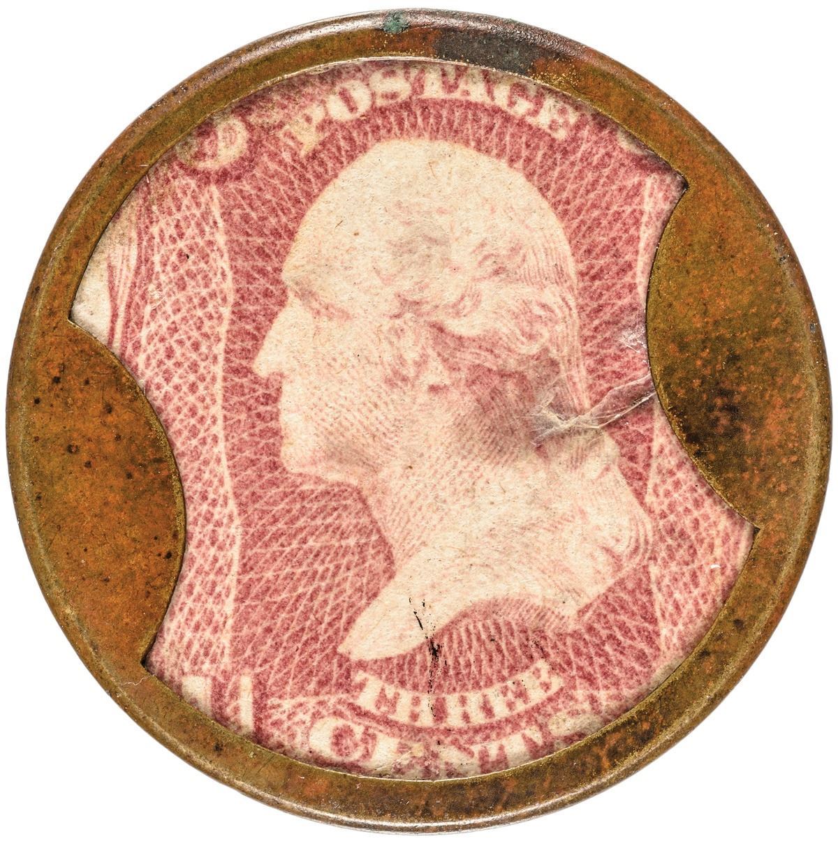 Description: Rated as Rarity-6 (16 to 20 known) according to Fred Reed. A somewhat tougher number to locate as this 3¢ denomination is far scarcer than either the Five or Ten Cents higher denominations on this same issue. It has a well centered deep red George Washington stamp just a bit to the right and is fresh in its appearance. The mica is clean, clear and unbroken with just a trivial surface craze by the right moon from circulation. The case is very nice and has a natural medium-chestnut color with sharp details.