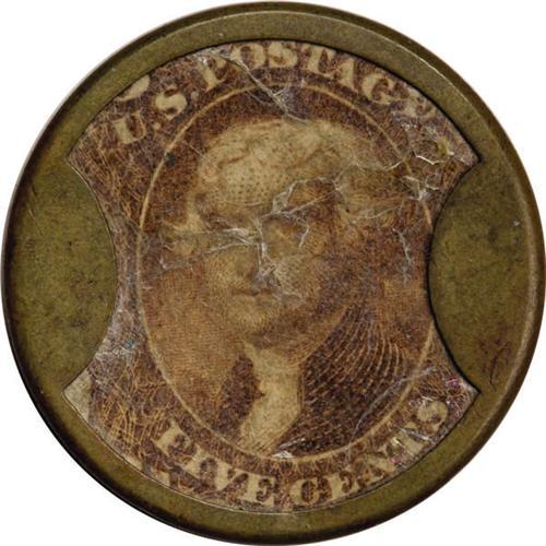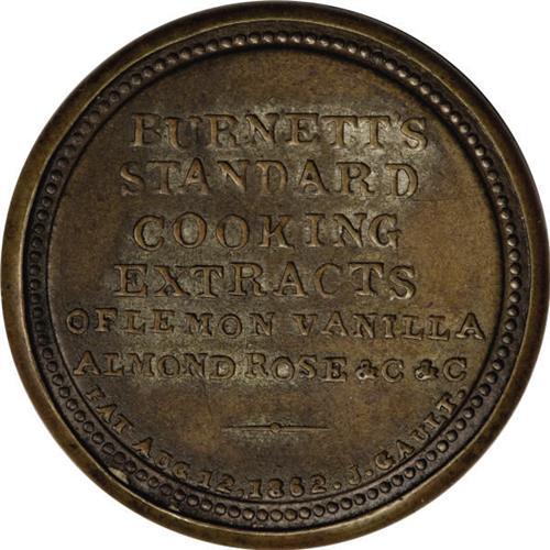 <B>HB-83 EP-70 Scott-54 Reed-BE05 5¢ Burnett's Standard Cooking Extracts Extremely Fine.</B></I> The case is lovely with a touch of silver behind many of the letters. The stamp is a hair toned and the mica shows enough cracks and crazing to hide portions of the stamp and seriously reduce the value of an otherwise very nice piece. <BR><BR><b>Shipping:</b> Coins & Currency (<a target="_blank" href="http://www.heritageauctions.com/common/shipping.php">view shipping information</a>)