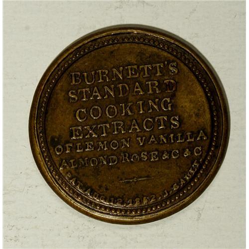 <B>HB-84 EP-106 10¢ Burnett's Standard Cooking Extracts Extremely Fine.</B></I> Called About Uncirculated as Lot 444 of the June 2004 Western Collection sale, but we feel it falls a bit short. It's a lovely problem-free piece, with an attractive case, a bright stamp and a near-perfect mica.<BR><BR><b>Shipping:</b> Coin/Currency (<a target="_blank" href="http://www.heritageauctions.com/common/shipping.php">view shipping information</a>)