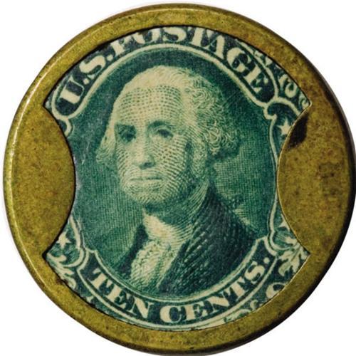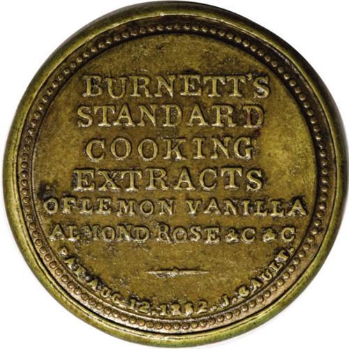 <B>HB-84 EP-106 10¢ Burnett's Standard Cooking Extracts Extremely Fine.</B></I> Called About Uncirculated as Lot 444 of the June 2004 Western Collection sale, but we feel it falls a bit short. It's a lovely problem-free piece, with an attractive case, a bright stamp and a near-perfect mica.<BR><BR><b>Shipping:</b> Coins & Currency (<a target="_blank" href="http://www.heritageauctions.com/common/shipping.php">view shipping information</a>)