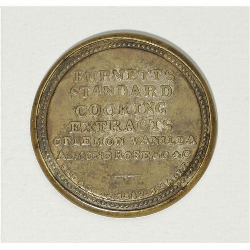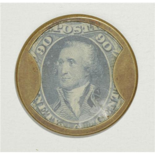 <B>HB-89 EP-184a 90¢ Burnett's Standard Cooking Extracts Extremely Fine.</B></I> Listed as unique in both the Hodder-Bowers reference and the Stack's sale of the Western Collection in June of 2004, where it was Lot 449. In actuality, this is one of two. Stack's graded the piece About Uncirculated, and while it certainly is lovely and problem-free, we feel it falls a hair short of that grade. The stamp is a lovely bright blue, the mica virtually perfect and the case retains a bit of its silvering behind the letters. It is tightly and perfectly sealed, and genuine beyond any doubt. This spectacular piece was one of the highlights of the Western Collection, and it will certainly be the key possession in the collection of Encased Postage it enters this evening. <I>Ex-Stack's June 23, 2004 sale, previously Julian Leidman April 17, 1981, previously Ken Goldman.</B></I><BR><BR><b>Shipping:</b> Coin/Currency (<a target="_blank" href="http://www.heritageauctions.com/common/shipping.php">view shipping information</a>)