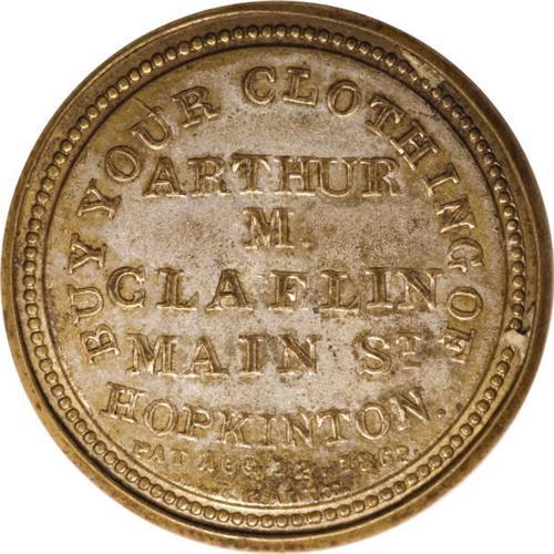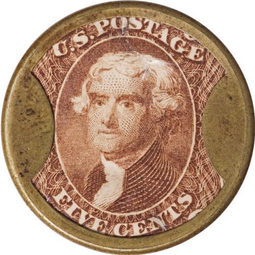 <B>HB-91 EP-71 Scott-61 Reed-CL05 5¢ Arthur M. Claflin Choice About New.<BR>Numerical grade: 85case.85stamp.70mica. = 240</B></I> A wonderful example that was previously Lot 451 from the Stack's June 2004 Western Collection sale. The case is a gorgeous About New with about 60% of its silvering remaining. The stamp is beautifully centered and fully fresh. The mica, although it is crystal clear in direct light, has two flaws: a minor craze at the lower right and a somewhat larger craze and crack running from the top into Jefferson's hair. Reed considers this 5¢ Claflin as an R-9, meaning two to four known. His auction census shows twelve appearances in 104 years. The Hodder-Bowers book states that there are two or three known, and we know of only this piece and one other. Whether the count is two or three, this is likely to be the only buying opportunity for a Five Cent Claflin for years to come. Frederick Mayer paid $14,950 for this piece over three years ago, and we anticipate that number's being easily eclipsed this evening.<BR><I>From The Frederick Mayer Collection</B></I><BR><BR><b>Shipping:</b> Coins & Currency (<a target="_blank" href="http://www.heritageauctions.com/common/shipping.php">view shipping information</a>)
