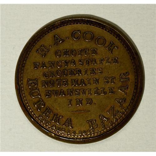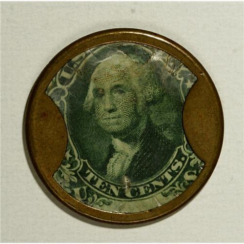 <B>HB-95 EP-108 10¢ H.A. Cook Very Fine.</B></I> Only two denominations are known for this merchant. The 5¢ is represented by five examples, and this more common 10¢ has a census of about a dozen pieces. Cook's business was in Evansville, Indiana, making this one of Gault's farthest afield customers. The case exhibits even wear, and it is problem free. The stamp is quite bright, and the mica is disrupted by a few small marks, most to the upper right of Washington's head.<BR><BR><b>Shipping:</b> Coin/Currency (<a target="_blank" href="http://www.heritageauctions.com/common/shipping.php">view shipping information</a>)