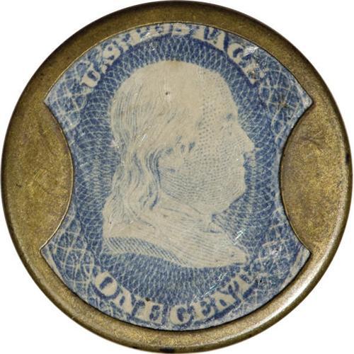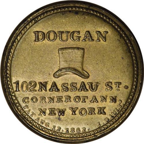 <B>HB-96 EP-12 Scott-66 Reed-DO01 1¢ Dougan Choice Extremely Fine.<BR>Numerical grade: 80case.80stamp.80mica. = 240</B></I> The One Cent Dougan is considered an R-7 by Reed (eleven to fifteen known), a number that everyone seems to agree is about accurate. The Hodder-Bowers reference feels that the 1¢ is represented by "fewer than ten" pieces. Our feeling is that ten is about right. Fred Reed's 104-year auction census shows 40 appearances of One Cent Dougans, which is exactly the same as the Three Cent. This piece is a beauty, with the light brass-colored case totally free of problems. The stamp is fresh and very well centered. The mica is clear, with two tiny internal flecks and a few natural striations. This piece was the Lilly example, sold by Stack's on December 6, 1969. In that catalog, where it was photographed both sides, they described it as, "Extremely Fine, choice... far superior to the Lilly specimen which fetched $240.00." The Lilly sale was in 1967. This piece, two years later, realized $270.<BR><I>From The Frederick Mayer Collection</B></I><BR><BR><b>Shipping:</b> Coins & Currency (<a target="_blank" href="http://www.heritageauctions.com/common/shipping.php">view shipping information</a>)