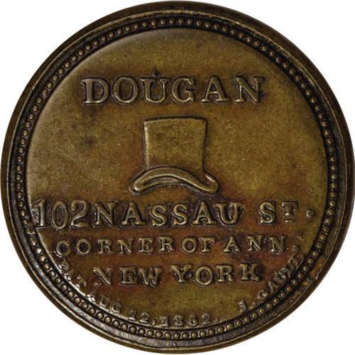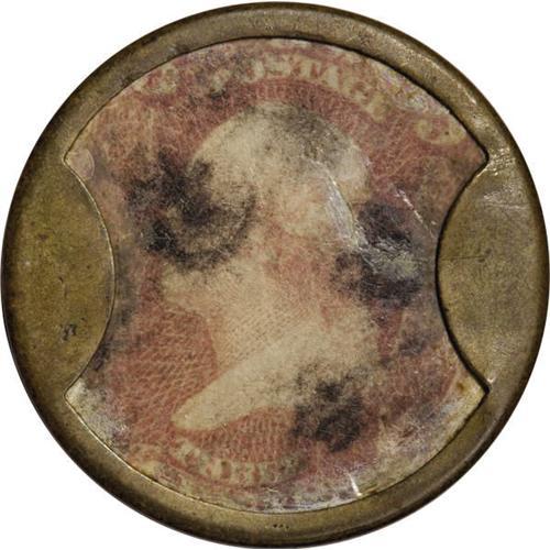 <B>HB-97 EP-41 Scott-67 Reed-DO03 3¢ Dougan About New.<BR>Numerical grade: 85case.20stamp.50mica. = 155</B></I> The case is a beauty. It's fully AU, with a glossy, deep mahogany surface with natural, deep red highlights behind the hat and letters. Viewed from the hat side, this is the nicest of Frederick Mayer's Dougans... don't turn it over. The stamp is faded and badly stained, with three dark areas killing its appearance. The mica has a few cracks and minor crazes. If you are forming a merchant set for exhibit, this piece has the look of a $5000 encasement from the merchant side.<BR><I>From The Frederick Mayer Collection</B></I><BR><BR><b>Shipping:</b> Coins & Currency (<a target="_blank" href="http://www.heritageauctions.com/common/shipping.php">view shipping information</a>)