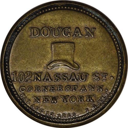 <B>HB-98 EP-73 Scott-68 Reed-DO05 5¢ Dougan Extremely Fine.<BR>Numerical grade: 70case.65stamp.60mica. = 195</B></I> The case is a solid XF with a nice, even medium tan color and no flaws. The stamp is rotated within the case, and it is a bit faded. The mica has a crack and crazed area from Jefferson's chin to the lower right. This is the Arnold Perl specimen Sold by Stack's on December 6, 1969. It was Lot 1021 in that sale, described, "Extremely Fine. Stamp is crooked. Very rare firm in this denomination." Reed's auction census shows 21 appearances of Five Cent Dougans, which of course includes multiple reappearances. He estimates the 5¢ to be an R-8+ (five to seven.) We are in agreement, as is the Hodder-Bowers reference and the Stack's June 2004 catalog.<BR><I>From The Frederick Mayer Collection</B></I><BR><BR><b>Shipping:</b> Coins & Currency (<a target="_blank" href="http://www.heritageauctions.com/common/shipping.php">view shipping information</a>)