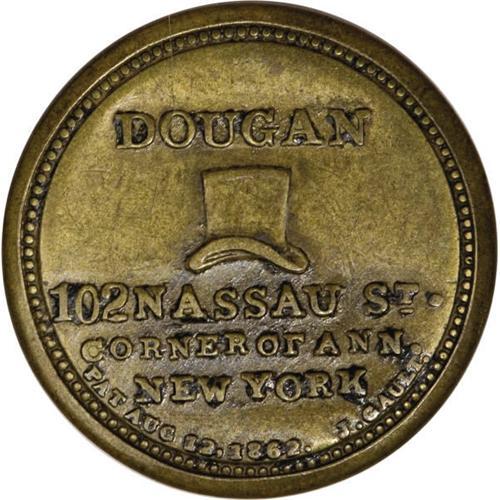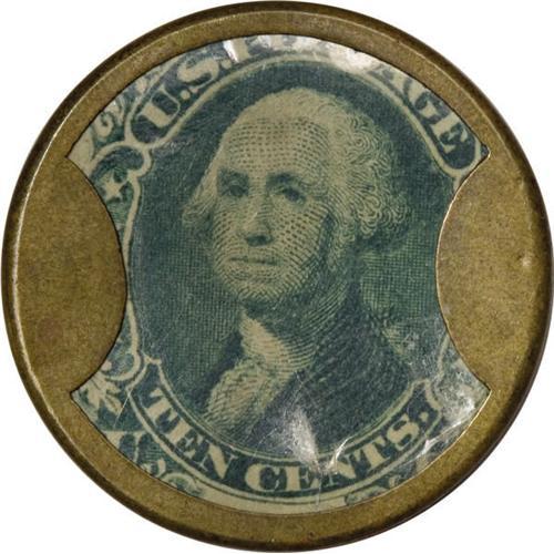 <B>HB-99 EP-109 Scott-69 Reed-DO10 10¢ Dougan Very Fine.<BR>Numerical grade: 50case.70stamp.60mica. = 180</B></I> The case has a considerable amount of actual circulation wear, but is totally problem free and an attractive light brass color. The mica and stamp have held up incredibly well on this piece which had to circulate for quite some time for the letters to flatten as they did. The stamp has all its color, and the mica shows only a few minor marks at its outer edge that detract not at all from this wholesome and very rare piece.<BR><I>From The Frederick Mayer Collection</B></I><BR><BR><b>Shipping:</b> Coins & Currency (<a target="_blank" href="http://www.heritageauctions.com/common/shipping.php">view shipping information</a>)
