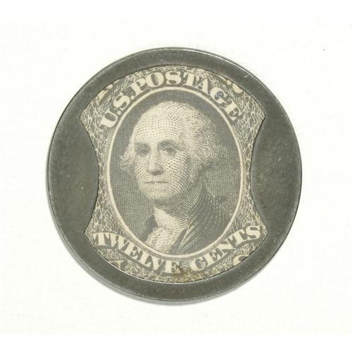 <B>HB-Unlisted EP-Unlisted 12¢ Trial or Experimental Piece Silver Case Choice About New.</B></I> Identical to Lot 643 of the Stack's June 2004 sale, but, although called unique there, this is a different piece. The stamp is centered differently, the mica on this piece is absolutely perfect, and various diagnostics in their photograph are not present on this piece and vice versa. Our consignor has owned this piece for quite awhile, and it likely came from the same source as the pieces in the 1968 Herst sale. Identical in style and material to the 10¢ offered below.<BR><BR><b>Shipping:</b> Coin/Currency (<a target="_blank" href="http://www.heritageauctions.com/common/shipping.php">view shipping information</a>)