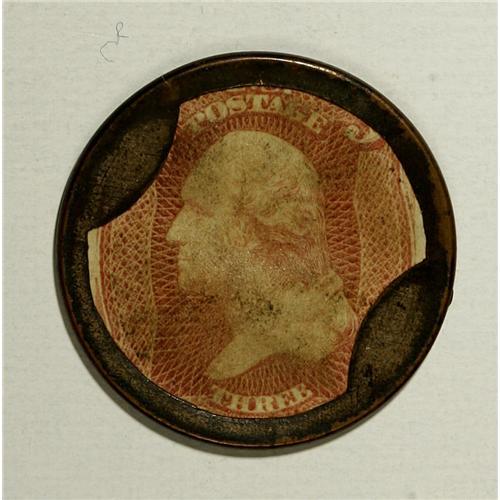<B>HB-Unlisted EP-Unlisted 3¢ Trial or Experimental About Uncirculated.</B></I> The piece lacks any mica, apparently as-made, and consequently the exposed stamp is lightly soiled. Previously Lot 638 from Stack's June 2004 sale. It was described there, "The case is different, the front having smaller tabs than seen on the regular Gault encasement, and also a wider frame on the front than on the regular issues. On the back, there is a wider edge wrapped around the single back piece, providing a snug fit. In the introduction to these experimental pieces, Stack's noted that this was from the Boyd Collection, and that it is impossible to say with certainty where these pieces originated or what their purpose was. They have been widely accepted as trial or experimental pieces, and the ten or so known examples of all denominations and varieties are avidly sought after. This is the first of several we have to offer, and in 30+ years of dealing in encased postage, this cataloger has handled no others.<BR><BR><b>Shipping:</b> Coin/Currency (<a target="_blank" href="http://www.heritageauctions.com/common/shipping.php">view shipping information</a>)