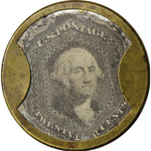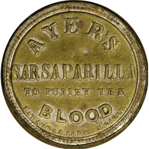 <B>HB-unl EP-160? Scott-unl Reed-AS24MD? 24¢ Ayer's Sarsaparilla Medium Ayers Very Fine - May Not Be Authentic.<BR>Numerical grade: 55case.70stamp.65mica = 190</B></I> This is another piece that could go either way, but we are simply far too uncomfortable with it to call it good. The case shows irregularities on both sides, and it is also somewhat out of round. With pieces this rare, one needs to be ultra careful. We believe the preponderance of clear physical evidence indicates that this piece has very little commercial value.<BR><I>From The Frederick Mayer Collection</B></I><BR><BR><b>Shipping:</b> Coins & Currency (<a target="_blank" href="http://www.heritageauctions.com/common/shipping.php">view shipping information</a>)