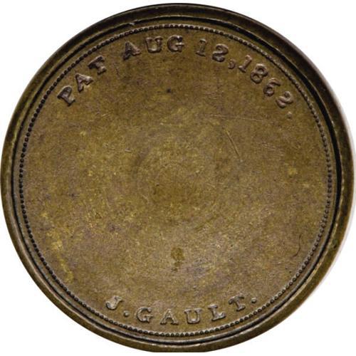 <B>HB-unl Reed-JG1057 10¢ J. Gault 1857 Stamp About New.</B></I><BR> This piece was previously Lot 1489 from Kagin's February 1988 sale. It is pictured on page 74 of Fred Reed's <I>Civil War Encased Stamps - The Issuers and Their Times</B></I>. Without a doubt, this is a genuine Scovill-Gault production piece, although why it was produced is an unanswered question. The stamp used was in use from August 1859 until demonetized in August 1861. It was demonetized at the start of the Civil War for the purpose of rendering the stamps that remained in the seceded states valueless. It's certainly possible that since Five and Ten Cent J. Gault pieces were the earliest produced, this was a sample or trial piece made with any handy stamp. In spite of the stamp's being valueless, the piece clearly spent at least a short time in circulation. The case shows the normal minor circulation scratches common to all lightly used examples. The mica has a crack running from the bottom well up into Washington's portrait, and there is a moderately heavy craze at the bottom of the left tab. Whatever its original purpose, it is unquestionably genuine and contemporary. This piece is a significant part of Encased Postage history.<BR><I>From The Frederick Mayer Collection</B></I><BR><BR><b>Shipping:</b> Coins & Currency (<a target="_blank" href="http://www.heritageauctions.com/common/shipping.php">view shipping information</a>)