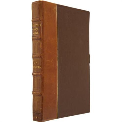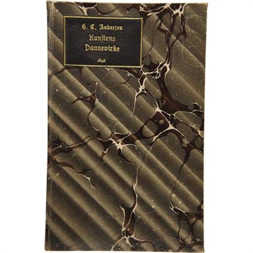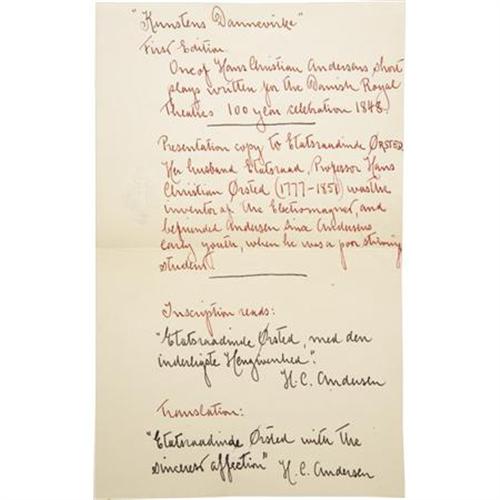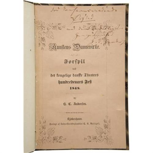 <B>Hans Christian Andersen. Signed First Edition of </B></I><B><I>Kunstens Dannevirke</B></I></B></I> (<I>The Bulwark of Art</B></I>)<I>.</B></I> Copenhagen: C.A. Reitzel, 1848. <BR>First edition. Presentation copy signed and inscribed by the author to the wife of noted Danish physicist and chemist Hans Christian Orsted. Twelvemo. 22 pages with marbled boards and a leather gilt-inscribed label on the cover. <BR><BR>A short play concerning the relationship between art and politics, written as a prelude at the centenary celebration of the Royal Danish Theatre in 1848, with music by H. Rung. The play was first performed on December 18 of that year and received "almost three rounds of thunderous applause." Small tear on title page; occasional light foxing. Moderate wear to spine and corners of covers. Housed in a custom half-leather case with gilt lettering and raised bands at spine. Extremely rare!<BR><BR>This copy once belonged to noted Danish-American actor and Andersen enthusiast Jean Hersholt, and was in fact purchased from the estate of Hersholt's daughter. Hersholt assembled a large collection of Andersen books, and books relating to him, most of which are now in the Library of Congress. Hersholt translated over 160 of Andersen's fairy tales into English, published in 1949 as "The Complete Andersen." In 1939 Hersholt helped to form the Motion Picture Relief Fund, and for this, and his many charitable efforts, the Academy of Motion Pictures created the Jean Hersholt Humanitarian Award, given annually to the "individual in the motion picture industry whose humanitarian efforts have brought credit to the industry."<BR><BR>A note accompanying the book, dated July 31, 1935, confirms that it was given by Jean Hersholt and his wife "To Ebba With a lot of birthday greetings from Via and Jean<I>.</B></I>" Inside the card, ever the Andersen scholar, Hersholt explains the history behind this particular copy of Andersen's work, and even provides a translation of the inscription. A truly fascinating and unique presentation copy of a scarce Andersen work, made even more desirable by the fact that it was once owned by a Hollywood legend. <I>From the Robert and Diane Yaspan Collection.</B></I><BR><BR><b>Shipping:</b> Books & Catalogs (<a target="_blank" href="http://www.heritageauctions.com/common/shipping.php">view shipping information</a>)