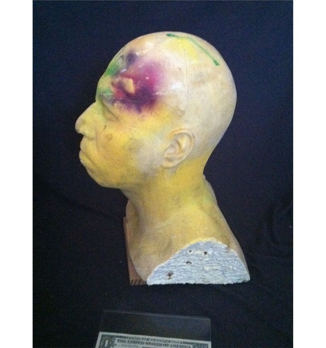 This is a human head and neck sculpting made of rigid foam on a wood stand.