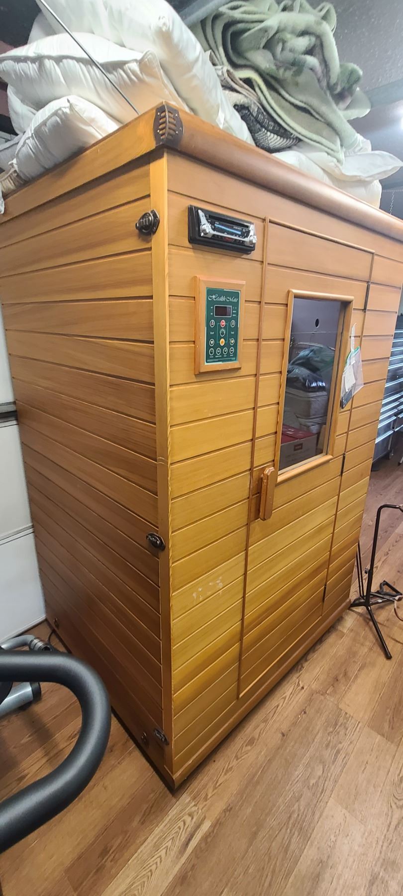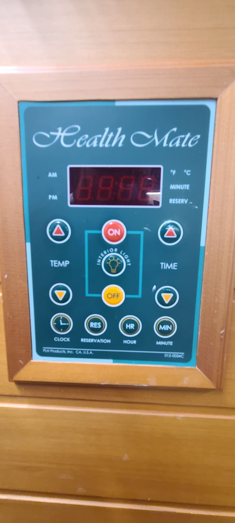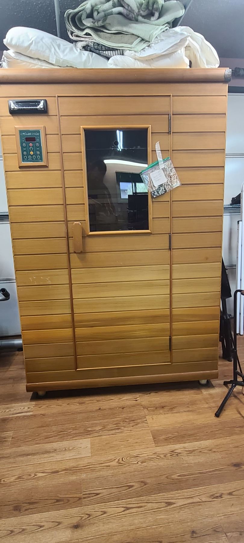 HEALTH MATE INFRARED SAUNA MODEL NUMER 012-0034C HM-NSE-2-CD. COMES WITH BUILT IN RADIO. 74" X 49" X 40". WORKS