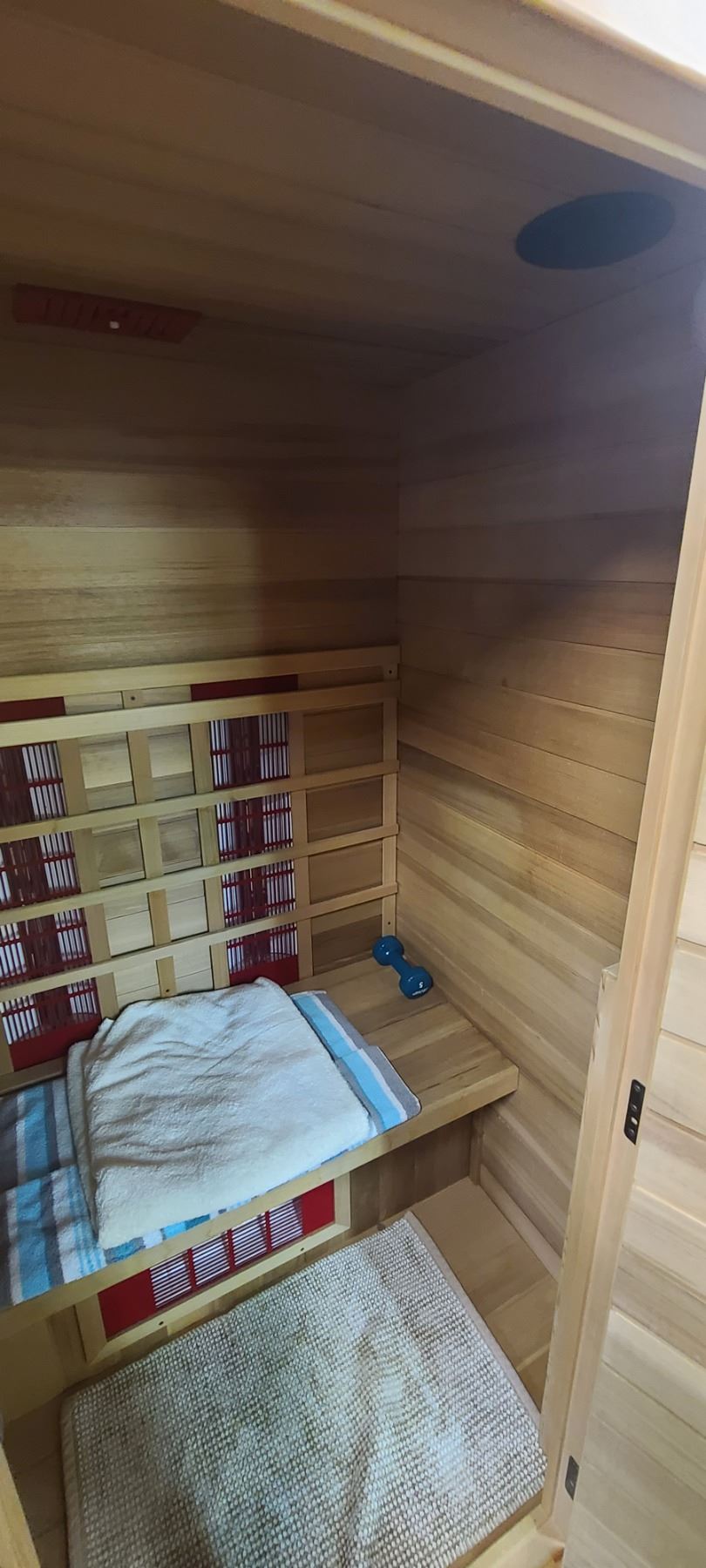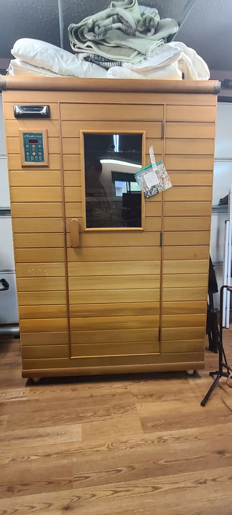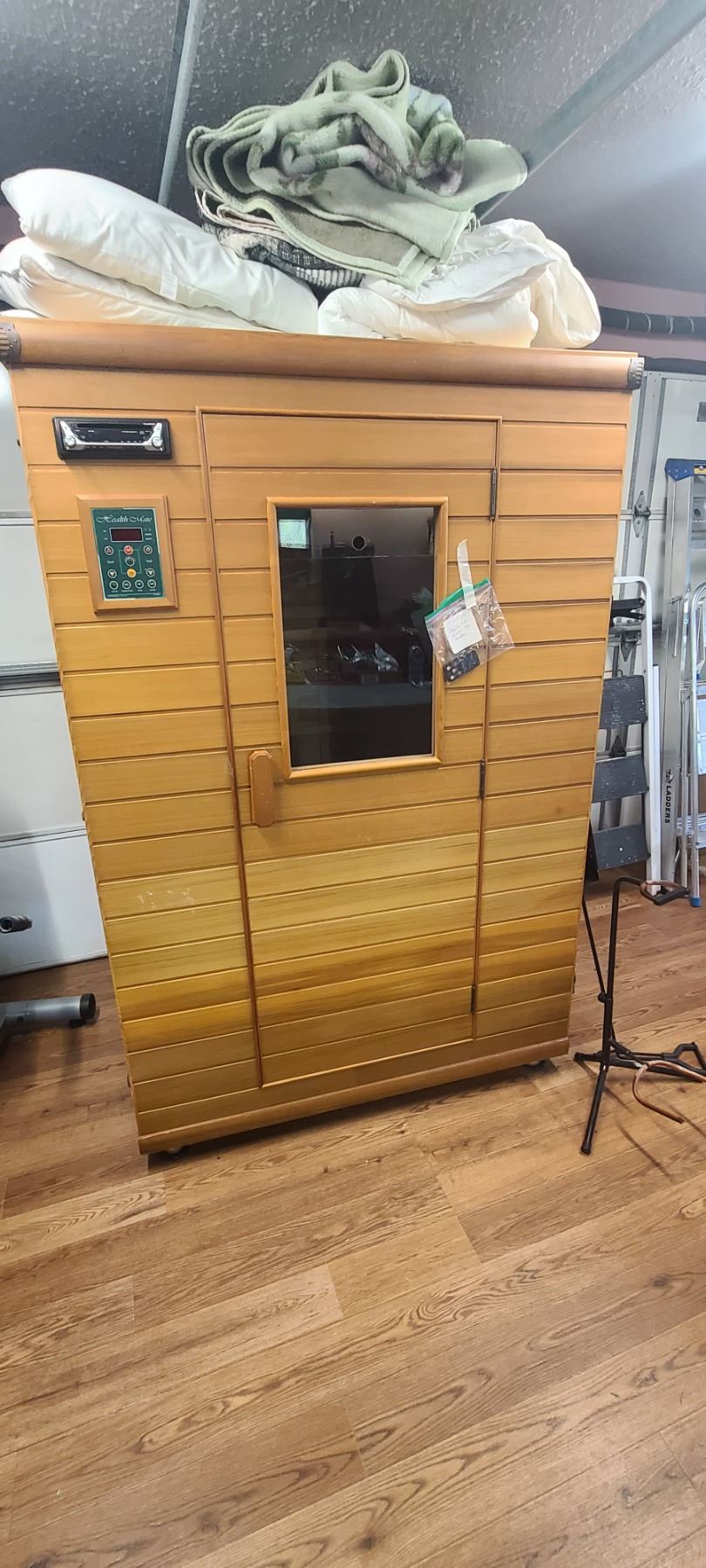 HEALTH MATE INFRARED SAUNA MODEL NUMER 012-0034C HM-NSE-2-CD. COMES WITH BUILT IN RADIO. 74" X 49" X 40". WORKS