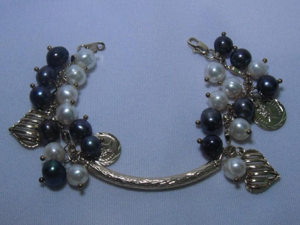 HEART-COIN BLACK AND WHITE PEARL CHARM BRACELET; AUTHEN **|**|** HEART-COIN BLACK AND WHITE PEARL CHARM BRACELET; AUTHENTIC PHILIPPINE PEARL; METAL-14/20 CHAIN; SIZE -8 INCH ; MSRP: $300