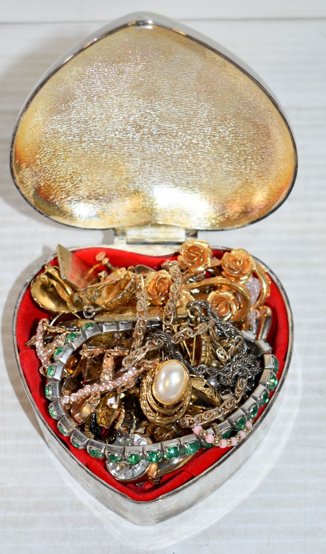 HEART JEWELERY BOX W/ VARIOUS CONTENTS
