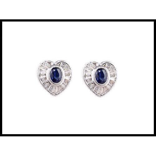 18K solid white gold has been beautifully formed to these heart shaped earrings. 2 center natural sapphires total .64 carats, and 44 taper baguette diamonds weigh .74cts, tw.
