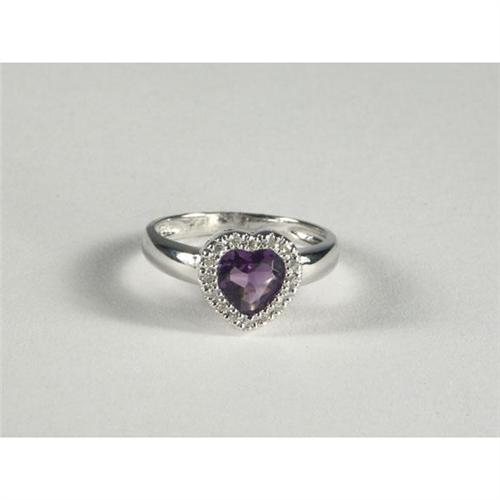 RING: Lovely 14k white gold lady's ring set with a heart shaped amethyst accented by diamonds. The purple amethyst measures approximately 1.15 cts and is transparent. The diamonds measure approximately 0.10 ctw, have SI1 to I1 clarity and I color. Appraisal included.