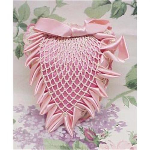 LOVELY HEART SHAPED PIN CUSHION, MADE FROM PRETTY PINKFABRIC, SATIN LIKE,PINK SATIN BOW AND CROCHETED LACE,EXCELLENT CONDITION, MEASURES 6 1/4" X 5 1/4", US BUYER TO PAY 4.00 PLUS INSURANCE.THANKS