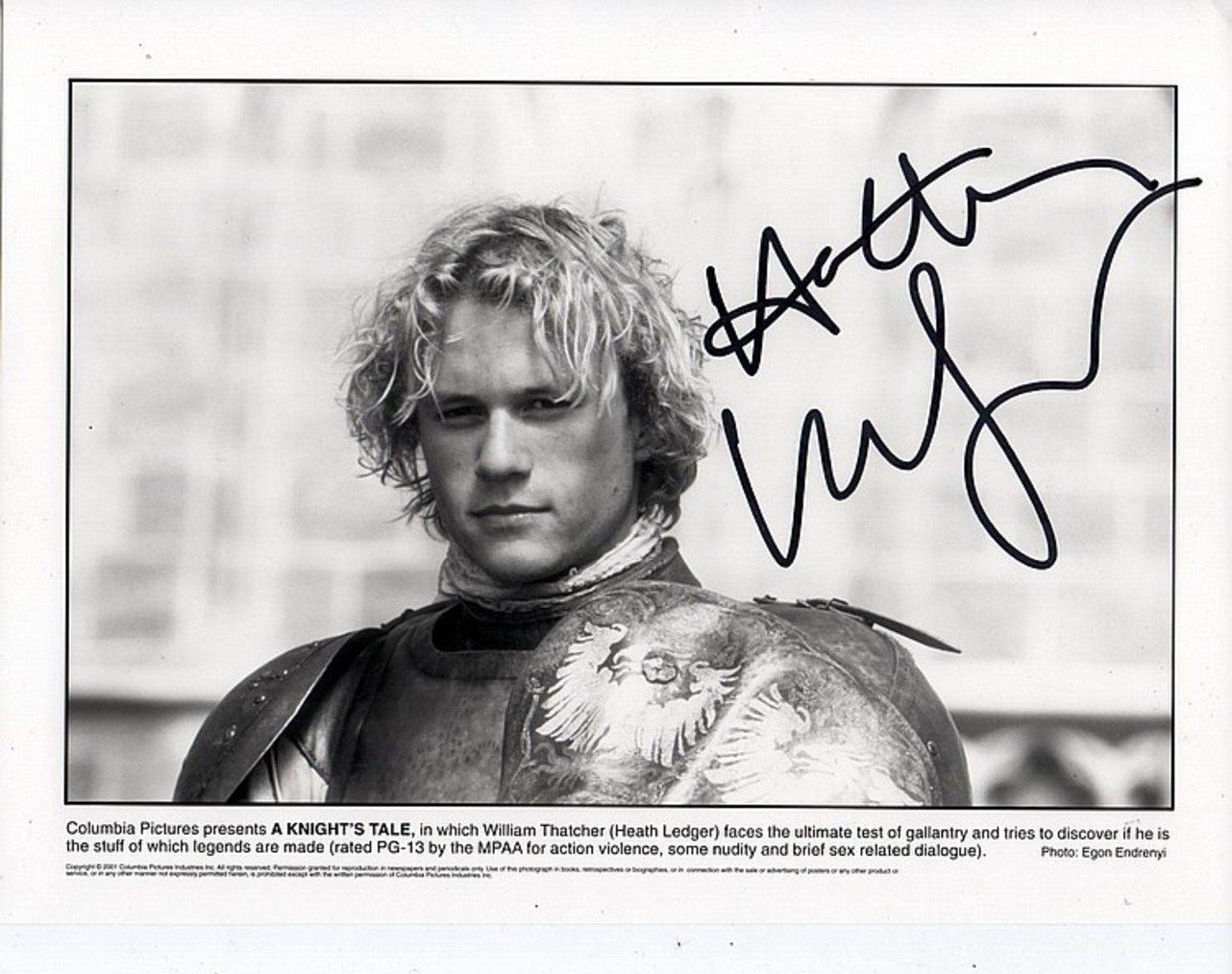 Heath Ledger in 'A knights tale' signed by Heath in sharpie. 10x8 inches. Supplied with coa. Heathcliff Andrew Ledger was an Australian actor and director. After performing roles in several Australian television and film productions during the 1990s, Ledger left for the United States in 1998 to develop his film career.