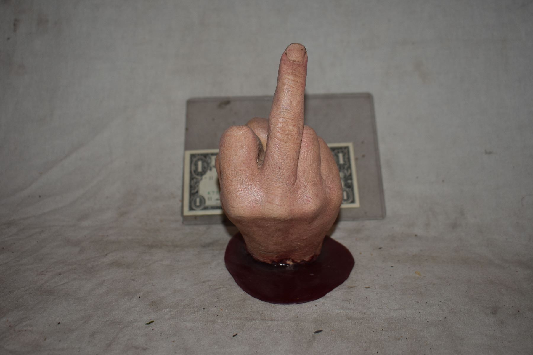HEATHERS SEVERED BLOODY SILICONE HAND GIVING THE FINGER.