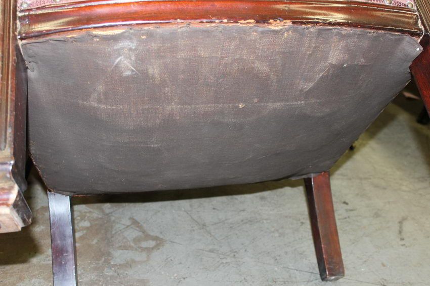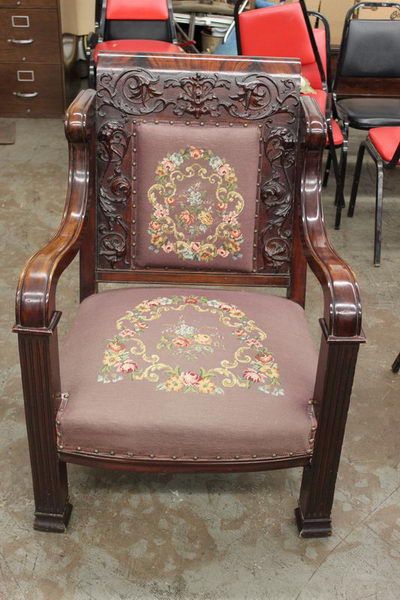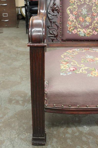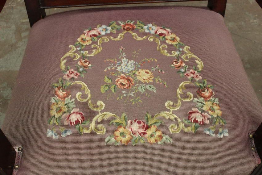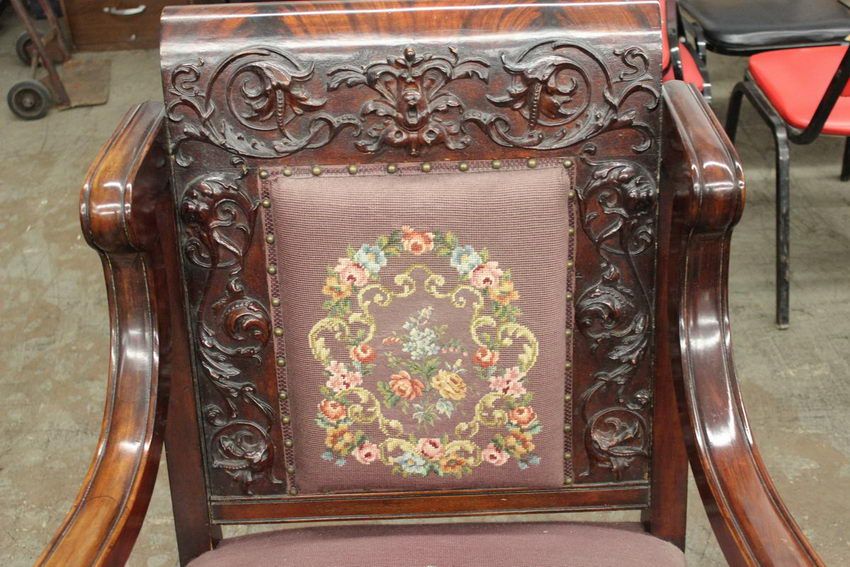 HEAVELY CARVED MAHOGANY CHAIR WITH ROSEWOOD BACK EXCELLENT NEEDLE POINT