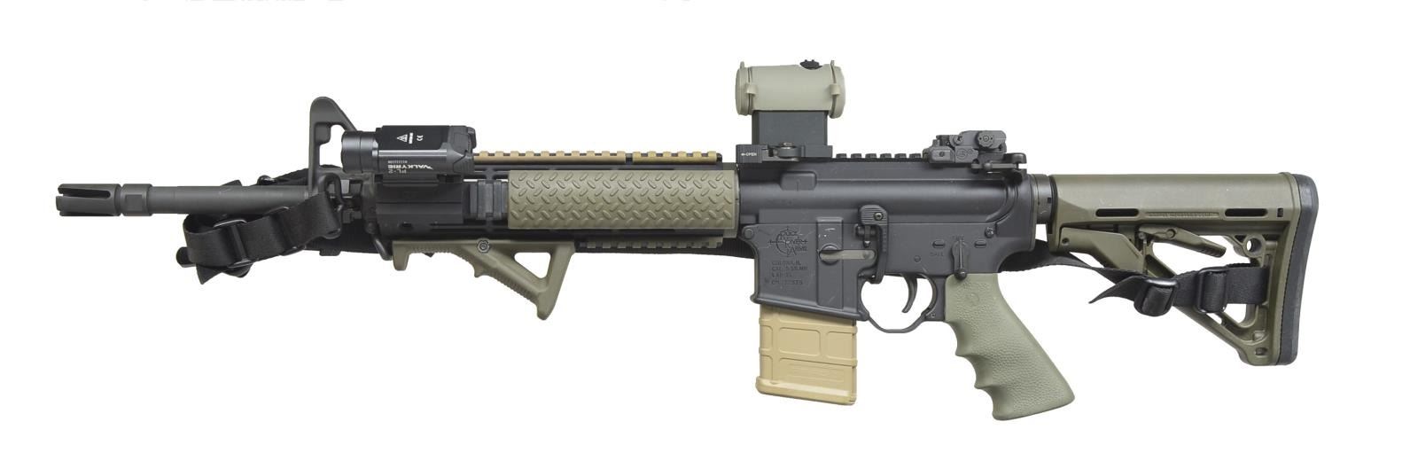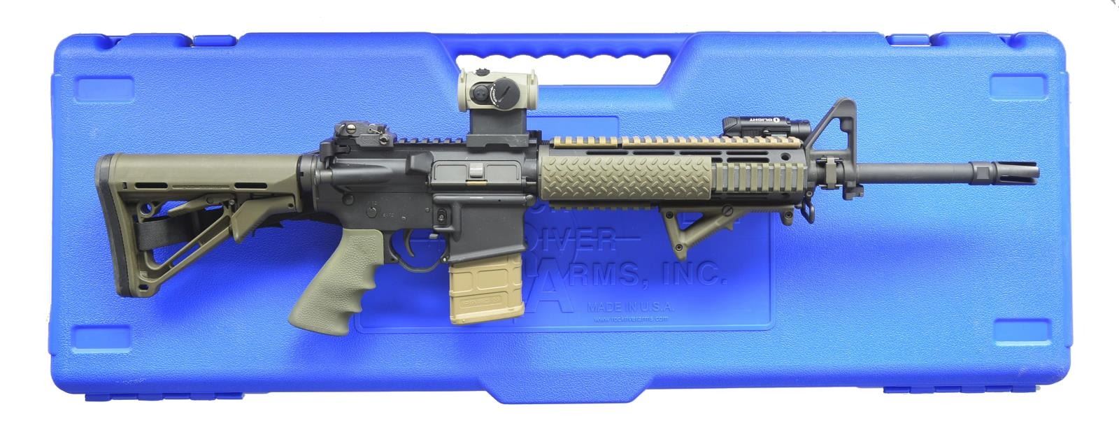 BARREL CARBINE. Cal. 5.56. S# CM172575. Bbl. 16". Heavy bbl. Rock River Arms LAR-15, heavily decked out w/ vortex style flash hider. Standard gas block w/ bayonet lug & sling swivel. Additional left side sling swivel add on. Currently sporting 5.11 padded sling. Free floating quad rail handguard w/ O-Light Valkyrie PL-2 mounted at 10 o’clock. Magpul AFG. Remaining rail real estate wearing a variety of covers. Flat top keystone upper receiver w/ brass deflector & forward assist. LaRue LT660 QD Riser w/ Micro Aimpoint red dot sight. Swan A.R.M.S. 40L .75 MOA rear peep sight. OD green rubber Rock Island pistol grip. 6-Position collapsible green Magpul CTR shoulder stock. Magpul ambidextrous bolt drop lever. Elongated trigger guard. MAGS: 3 TOTAL; 1 tan 20 rd. PMAG, 1 aluminum 20 rd. mag. & 1 aluminum 30 rd. mag. UNATTACHED ACCESSORIES: black Colt padded canvas transport bag, CAA vertical foregrip, Rock River Arms hard shell blue case, original owner’s manual & paperwork. CONDITION: finish on exposed metal surfaces complete & consistent w/ a few rub marks typically associated w/ vertical storage. Brass deflector finish wear indicates low usage. Red dot scope appears functional, unable to verify O-Light Valkyrie. Shiny bore w/ good rifling. Fire control mechanism appears to function correctly when cycled by hand. (21-1059/JZ). MODERN. $600-1,000.
