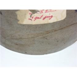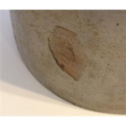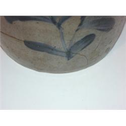 Heavily blue decorated stoneware crock. Decorated with floral decoration on front and back. Stamped number 2 on body. Has been professionally repaired. Large surface chip on back side and on flower decoration. 13.5" H