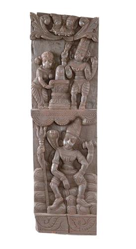 HEAVILY CARVED ORIENTAL PANEL. Fantastic panel is deeply carved in a very dark and dense wood. The interesting figures are those typically associated with Thailand and feature a man with four arms and a rearing cobra at his shoulder. Above him is a man and a woman standing beside a pedestal with a carved animal head above them. SIZE: 33” l x 10” w. CONDITION: Some splitting, otherwise very good. 5-71797-1132