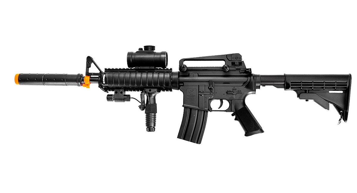 HEAVY DUTY M16 REPLICA DOUBLE EAGLE AIRSOFT GUN **|**|** A 1:1 scale replica of an actual M4 rifle, this Double Eagle electric airsoft gun is remarkably authentic. The M4 fires round 6mm plastic pellets known as BBs, which are propelled out of the gun by compressed air. The advantage of the airsoft rifle, however, is that players can safely train, simulate, or play with the gun without fearing serious injury. The M4 looks, feels, weighs, and functions just like a real firearm, but is built for casual recreation rather than weaponized use. In fac... ; MSRP: $0
