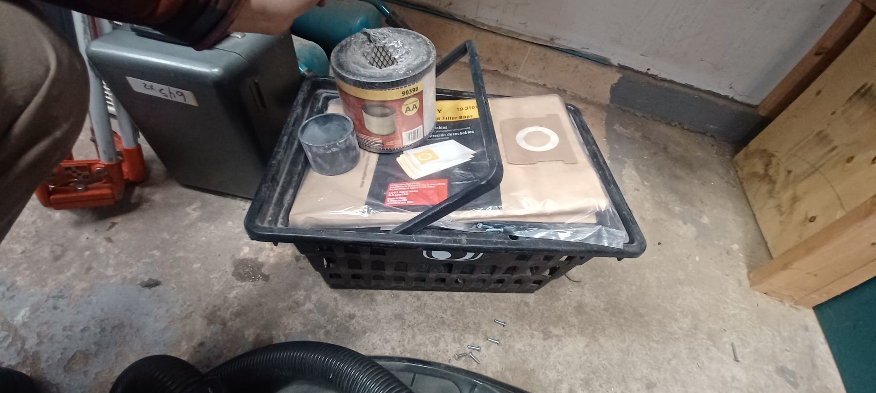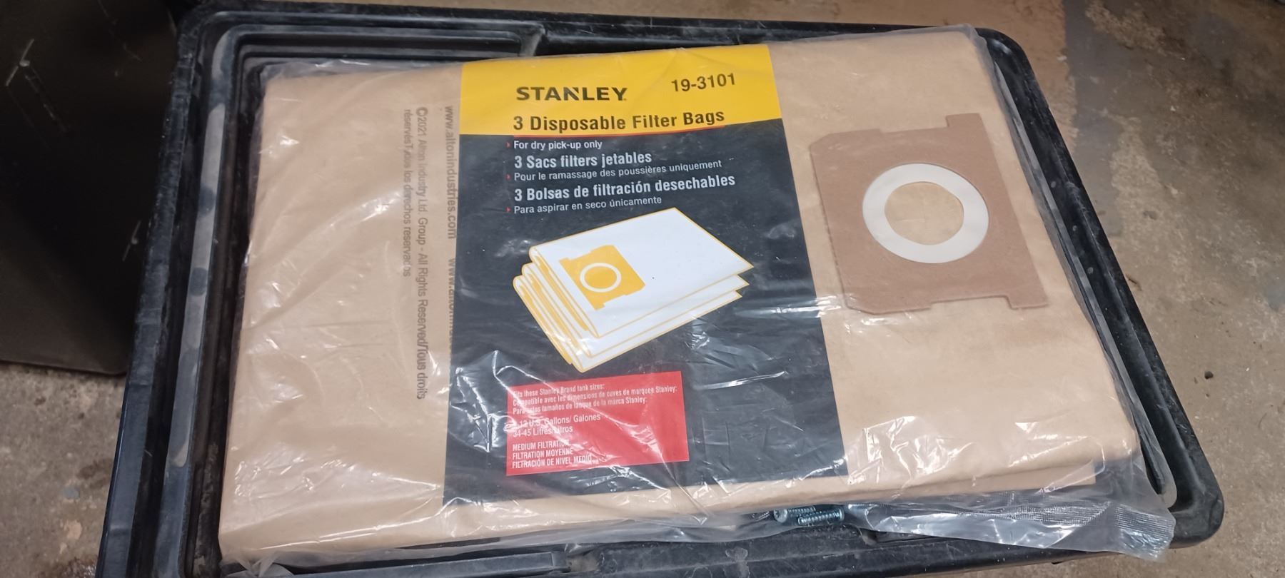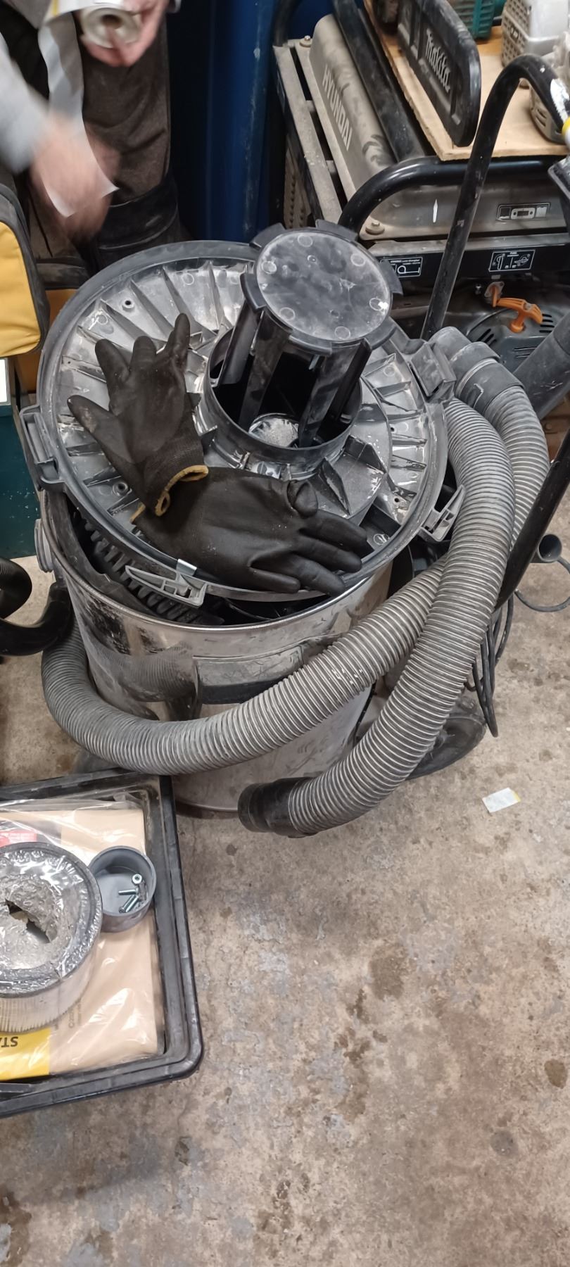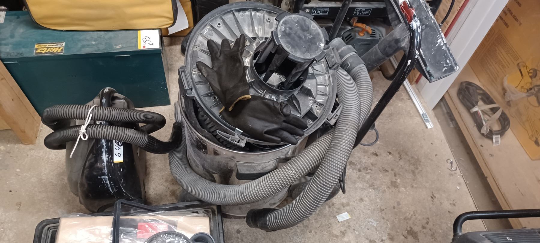 HEAVY DUTY STAINLESS STEEL SHOP VAC (NEEDS REPAIR) AND SMALLER VACUUM CLEANER, TOTE AND VACUUM BAGS