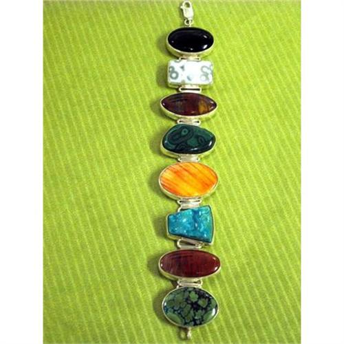 Auction is for a heavy sterling bracelet with 8 different stones. Bracelet measures 7.25" long and up to 1.25" wide. It weighs 65 grams!!! Stones are as follows: Black Onyx, Ocean Jasper, AZ Petrified Wood, Malachite, Spiney Oyster, AZ Chrysacolla, AZ Petrified Wood, Chinese Turquoise. This is a work of art, crafted by Dean Lunt of Arizona. He has signed the piece and stamped it STERLING.