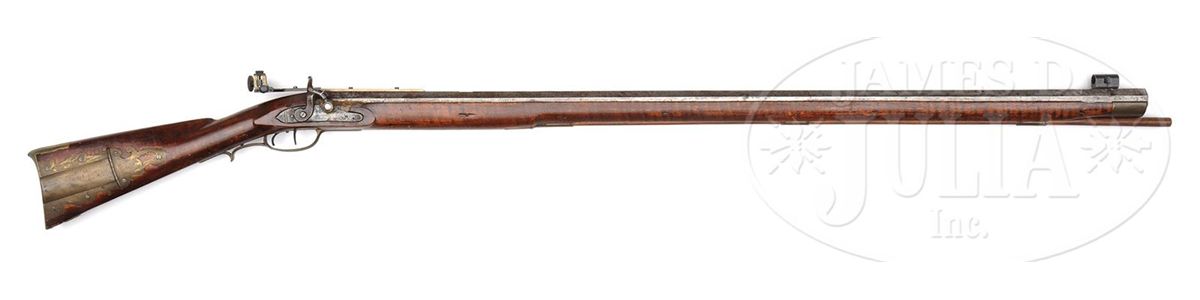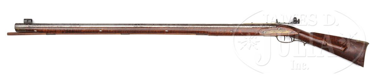 NSN. 44-1/2" full oct heavy .60 Cal rifled unmarked bbl. Percussion lock is converted from flint. 4-pc York style brass patchbox. Brass 2-screw sideplate. Double set triggers. Heavy bench target rifle equipped with modern target sights. This rifle was purchased from a family who claimed it was passed down from their grandfather A.W. Eichelberg who is buried in the York cemetery. Family history says it was purchased by him directly from C. Zorger. The rifle comes complete with all the accessories needed to load and shoot the rifle which has been often used in competition. CONDITION: Generally very good. Stock is sound. Some wood filler forward of percussion drum on lock. Bbl shows evidence of having held many different sights.A proven shooter. 4-49153 RG114