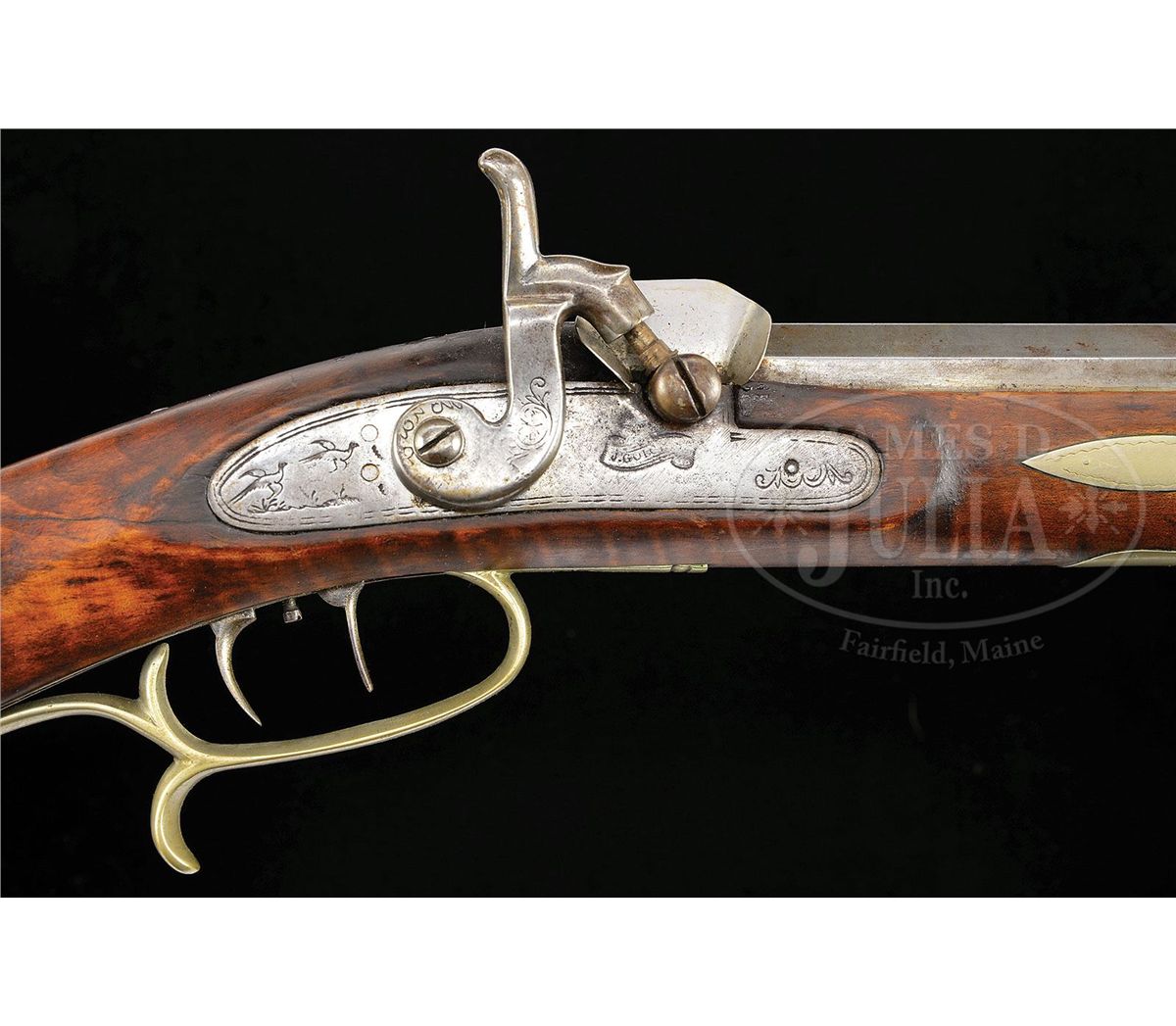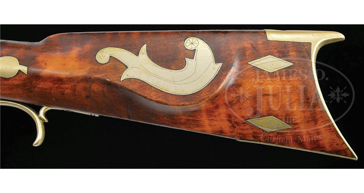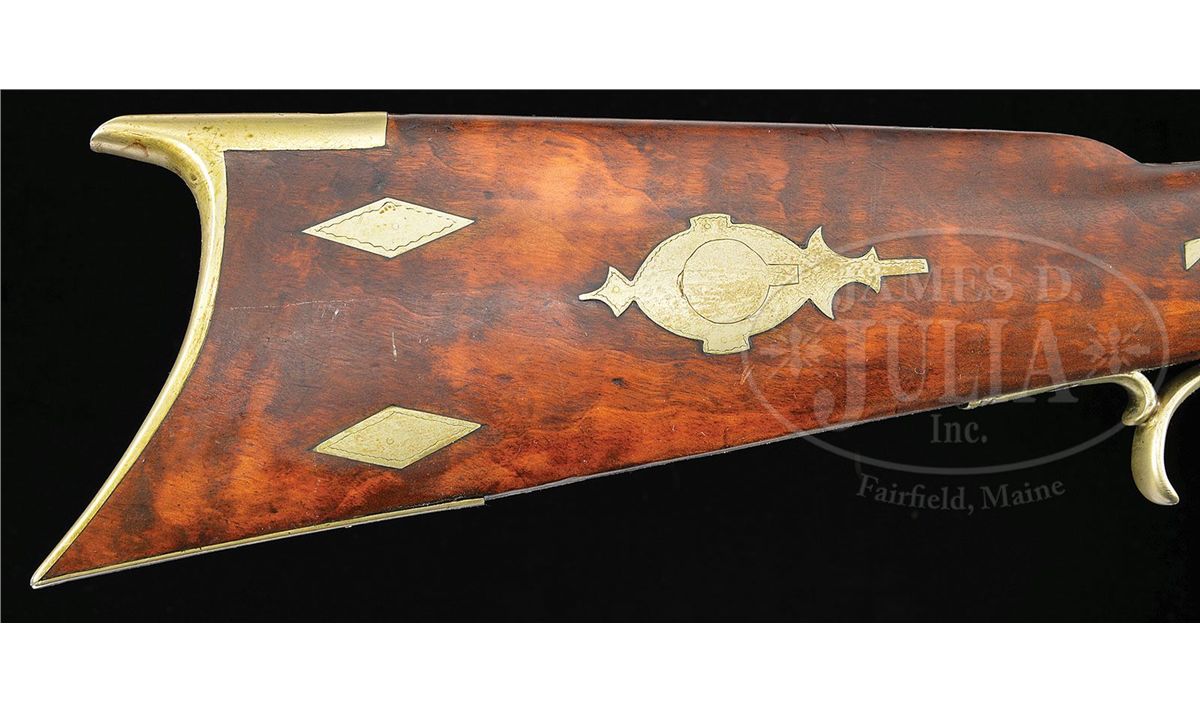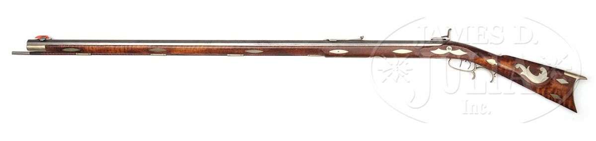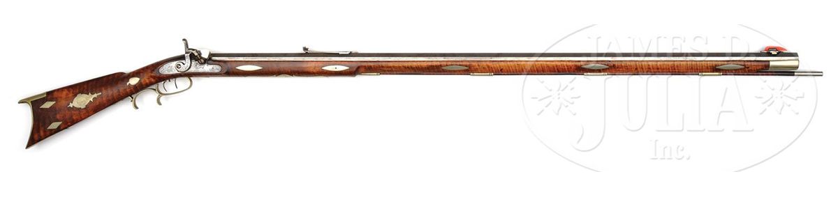 NSN. 45-1/2" full oct 45 Cal. rifled bbl. marked "M. M. Benson". Heavy bench target rifle has a blonde curly maple stock which is embellished with twenty silver inlays and a small silver cap box. Percussion lock was made by Philadelphia lock maker James Golcher. Rifle has a 6-1/2" silver saddleplate and the ramrod is held in place by four silver ramrod pipes. Nosecap is also silver. Bbl tang stretches 6" down the top of the wrist. There is a large 4" engraved adjustable rear sight and a large adjustable engraved front sight. This rifle appears to have been used in the recent past as a shooter. CONDITION: Very good condition. Solid, clean and original throughout with the an old crack in the wrist area. 4-49148 RG74