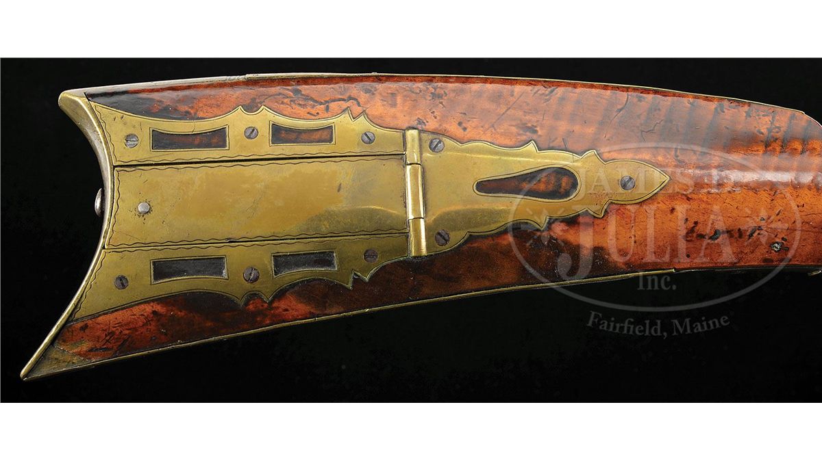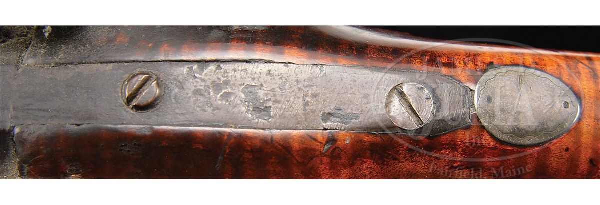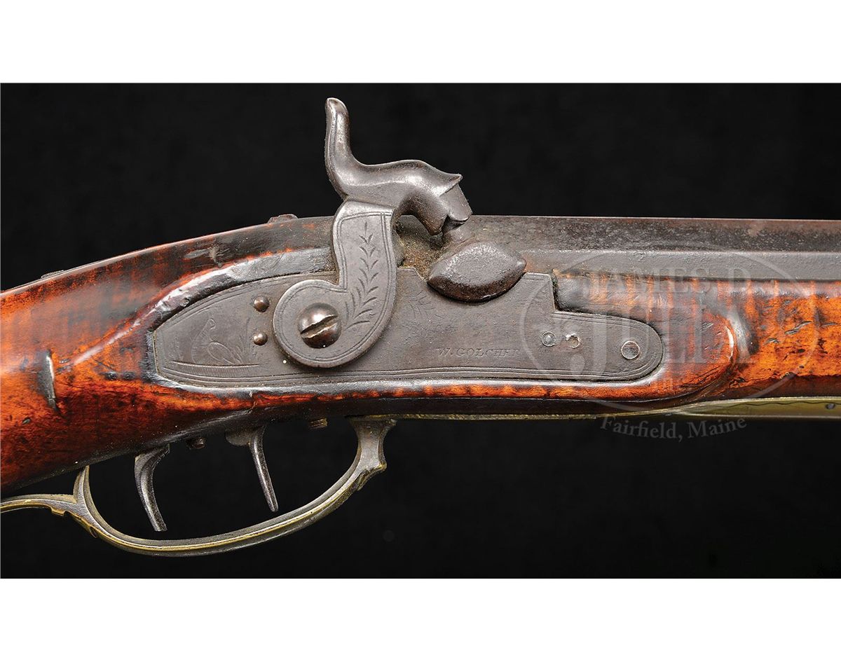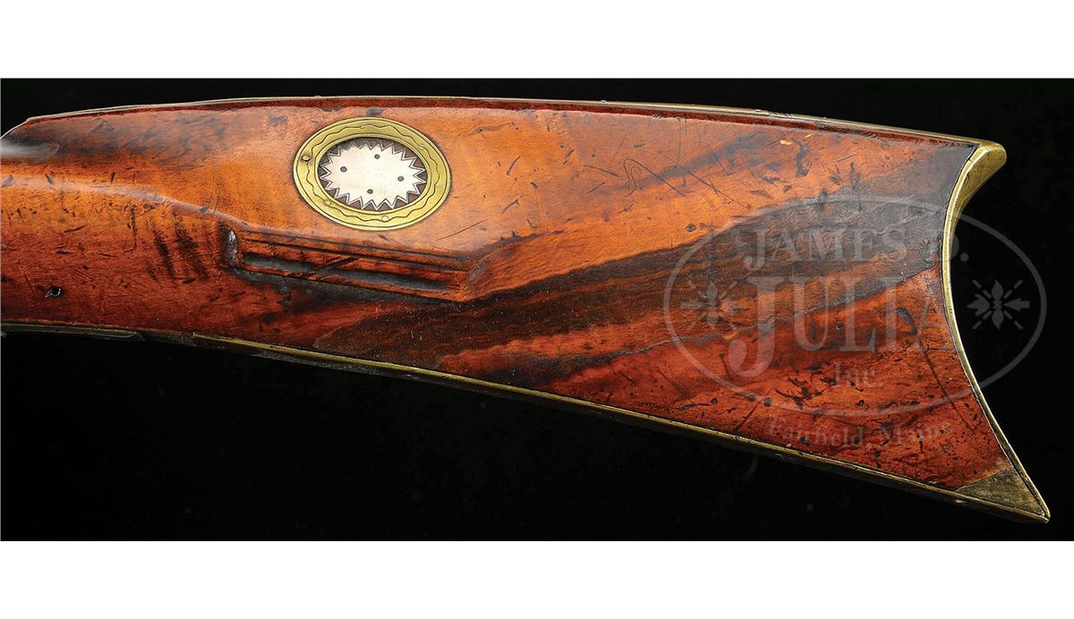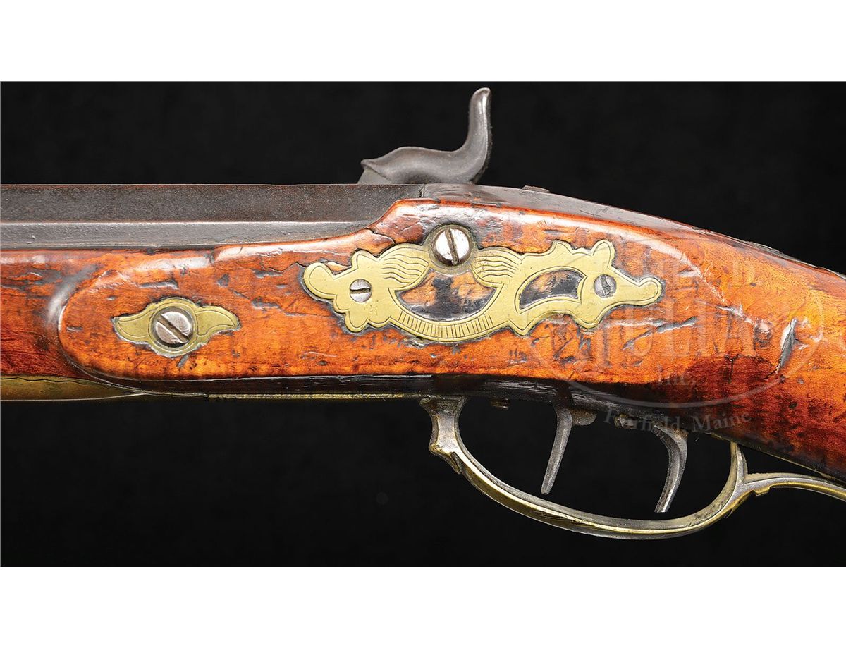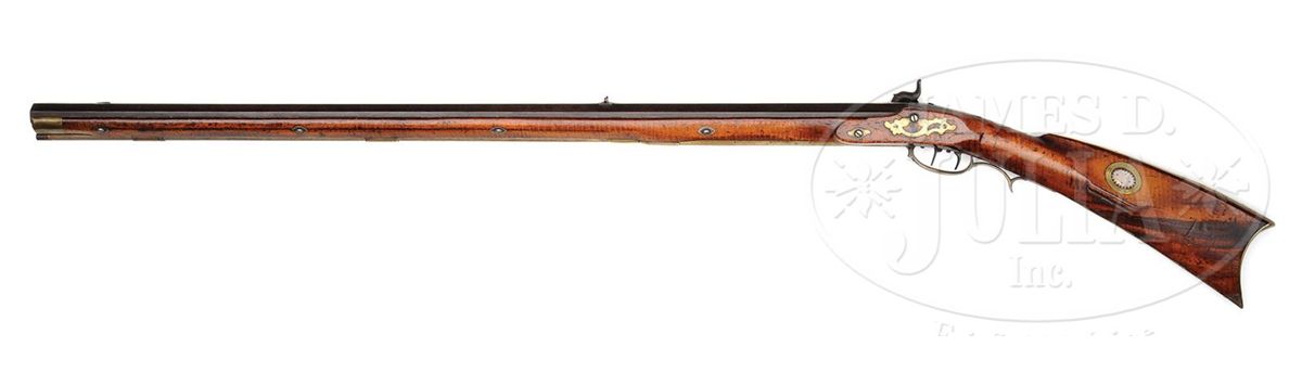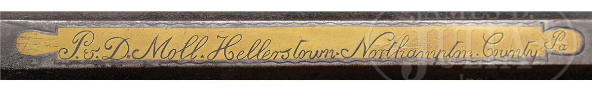 NSN. Cal. .58 rifled. This heavy target rifle has a 39" full oct bbl marked “P & D Moll Hellerstown, Northampton County Pa.” in a brass inlay on the top flat of the bbl. Peter Moll was born in 1799, the son of gunsmith John Moll II. Peter relocated to Hellertown about 1820 where he later went into business with his cousin David who was eight years his junior. Partnership was dissolved in 1853 upon the death of David. Bbl has a 3-3/4" long bbl tang and the Philadelphia percussion lock is marked W. Golcher. Rifle features a full brass saddle plate and full brass toe plate. Brass 4-piece patch box has five piercings and the rifle has a 7-1/2 comb inlay. The cheek inlay is a silver star burst inlay surrounded by brass and the side plate is 2-piece. PROVENANCE: Collection of Woody Frey. CONDITION: Rifle is in very good original condition with only a very small wood replacement at the toe. 4-48496 RG13