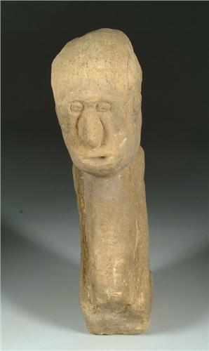 HEAVY SANDSTONE FIGURINE. Very similar to the Adam & Eve figurines found with the Duck River Catch in Tennessee which were of Mississippian age, Circa 1200-1500AD style. Comes in a nice wooden box. SIZE: 18in. h x 7-1/2in. w. CONDITION: Good. Slight damage at his squatting knees. 9-25984-117 The Tennessee Collection of Prehistoric Indian Artifacts from the Allen Graves Estate. SPECIAL NOTE: We do not regularly sell Prehistoric Indian stone artifacts and therefore have very little experience and no expertise in this area. All of the following lots have come from the Collection of the Late Allen Graves of Tennessee. The collection was inherited some years back by his daughter, who now lives in Maine. This collection was consigned to us directly from her. We employed someone to generally identify styles and types, but as stated above, due to our lack of expertise in this field, we can not guarantee the age or origin of the following pieces. We are relying on you, the buyer, to determine to your satisfaction the origin and age of each item in the collection.