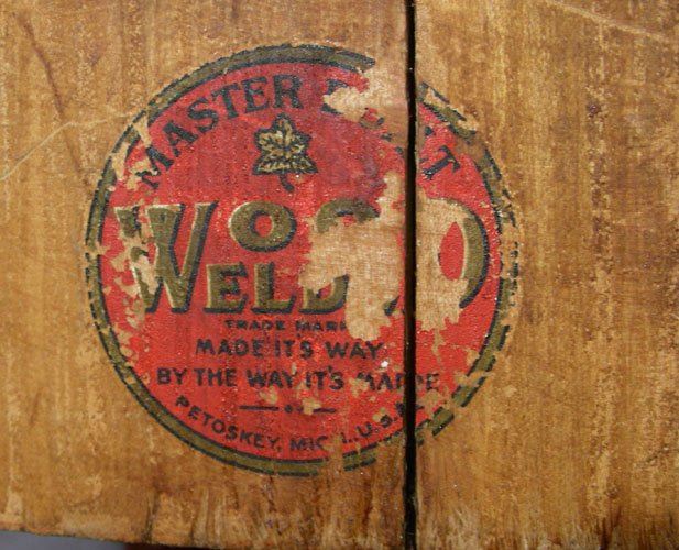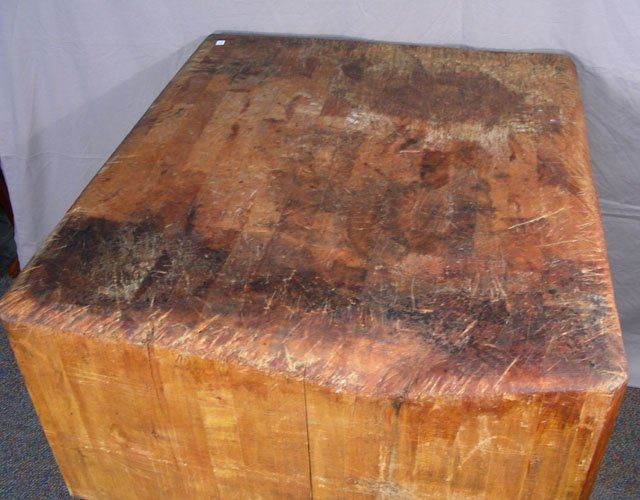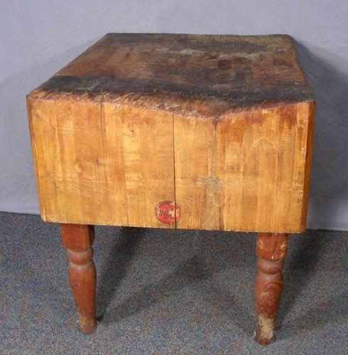 Made in Petoskey, Michigan. Class old butcher's block with original makers mark. 34" high, 35" wide, 30" deep.