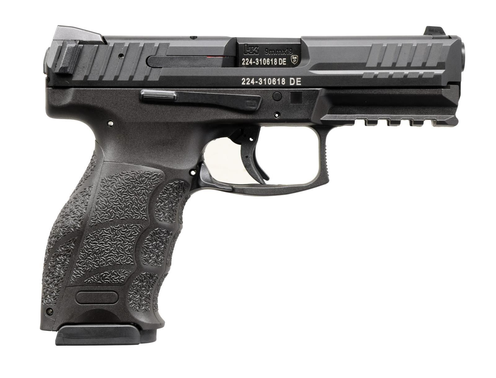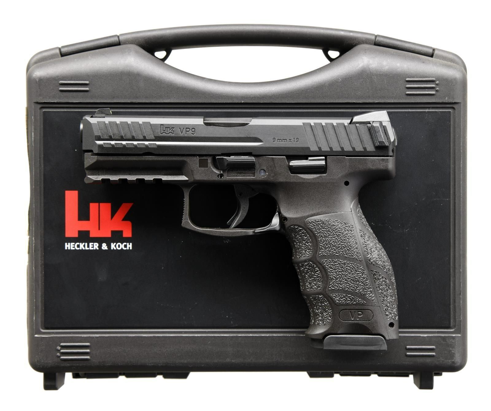 MATCHING FACTORY BOX. Cal. 9x19mm. S# 224-310618. Bbl. 4". VP9 semi-automatic pistol mfg. by Heckler & Koch in Germany and imported by HKI. The left side of the slide is marked with the "HK" logo, followed by the model and cal. designations, with the right side exhibiting the S#. Underside of frame is marked with HKI's importer information and the S#. Matte black finished slide and bbl. with textured black polymer frame. Standard sights with ambidextrous mag. release & slide release. MAGS: 2 17-rd. UNATTACHED ACCESSORIES: matching factory case. CONDITION: near new, with metal components retaining virtually all of their original factory finish overall. Brilliant mirror bore, exhibiting strong polygonal rifling throughout. Polymer frame is excellent overall. PROVENANCE: the Collection of Gun Sport Ltd owned by Jon R. Thomas. (23-2963/MLW). MODERN. $400-600.