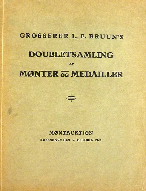 Hede, Holger. FORTEGNELSE OVER AFDØDE GROSSERER L.E. BRUUN'S DOUBLETSAMLING AF MØNTER OG MEDAILLER. København, 12. Oktober 1925 og følgende Dage. 4to, original printed card covers. (6), 154 pages; 6241 lots; 18 fine plates. Near fine. Scarce and important. Clain-Stefanelli 8798.