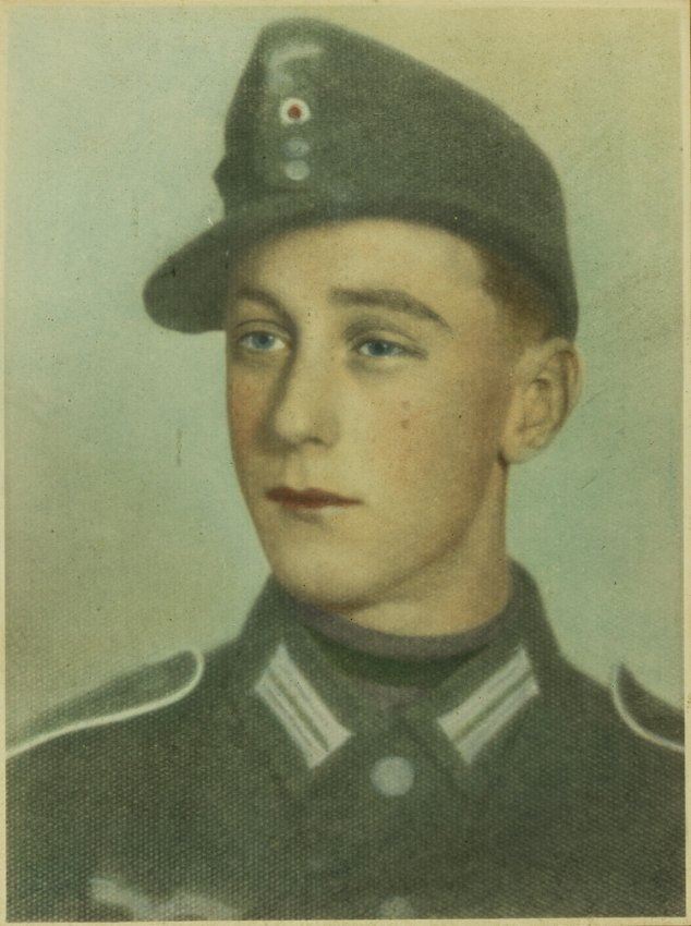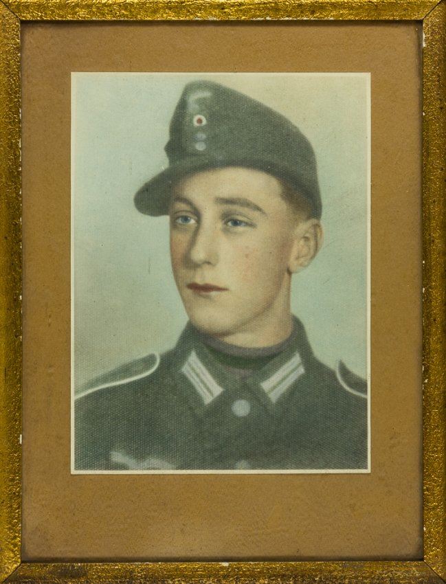 Fine original matte finish portrait of a Wehrmacht soldier, 7" x 9", showing the young man in a chest, up pose. The image has been expertly hand-colored by the photographer. Set in a period frame.