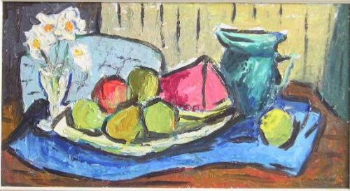 HEIMLICH, Herman, 1904-1986. "Still Life with Fruit". Huile sur toile, signée et datée "63". Oil on board, signed and dated "63". 16" x 30" - 40.6cm x 76.1cm.