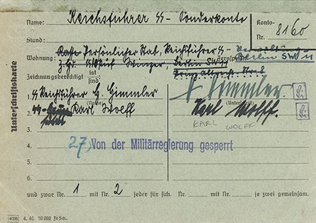 HEINRICH HIMMLER (1900 - 1945) Hitler's Chief of the Gestapo placed in charge of security and responsible for the construction and operation of extermination camps. He chose suicide rather than face a hangman's noose at Nuremburg. Frightening D.S., 1p. 12mo., a unnamed bank signature card for account no. 8160 held in a Berlin Bank, boldly signed by Himmler, also signed by KARL WOLFF, (1906-1975) Colonel-general in the Waffen-SS, liaison officer for Himmler with Hitler, German military governor of Northern Italy. Both Himmler and Wolff were allowed to sign solely. Interestingly, the card is stamped "Blocked from the Military Government". Fine. Himmler and the SS were known for having held secret accounts, some of which contained the proceeds of the sale of confiscated goods and gold obtained from their victims.