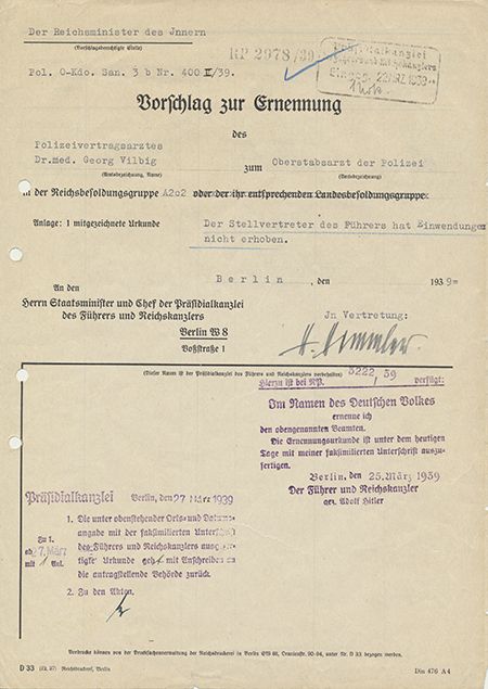 (1900 - 1945) Hitler's Chief of the Gestapo placed in charge of security and responsible for the construction and operation of extermination camps. He chose suicide rather than face a hangman's noose at Nuremburg. Partly-printed D.S., 4pp. 4to., Berlin, Mar. 25, 1939 a nomination form for Dr. George Vilbig as a police surgeon. Himmler approves the appointment on the first page with a bold signature. The interior of the document notes the physician's family, educational and professional background noting he was Catholic and married with three children. File holes at left with minor marginal tears, else very good condition. Postwar, Vilbig (ironically) developed the "metabolic grid", a weight-loss system.