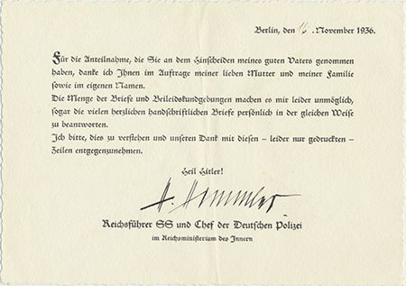 (1900 - 1945) Hitler's Chief of the Gestapo placed in charge of security and responsible for the construction and operation of extermination camps. He chose suicide rather than face a hangman's noose at Nuremburg. Rare partly-printed D.S. "H. Himmler" as Reichsfuhrer SS and Chief of the German Police, 1p. oblong 8vo., Berlin, Nov. 16, 1936, sent to a well-wisher upon the death of Himmler's father. In part: "For the condolences regarding my father, I thank you on behalf of my dear mother, our family, and in my name...I am unable to answer your handwritten letter personally in the same way...I would like you to accept our thanks with this printed card...". Himmler's father, Joseph Gebhard Himmler, was a secondary-school teacher and principal of the prestigious Wittelsbacher Gymnasium in Munich. He likely had a distinct role in Himmler's deep involvement in German folklore: while their mother sewed, Joseph would often read to the boys. These books on German history steeped Heinrich in the glories of medieval German knights and Wagnerian legends.