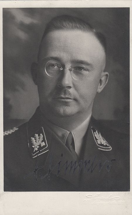 (1900 - 1945) Hitler's Chief of the Gestapo placed in charge of security and responsible for the construction and operation of extermination camps. He chose suicide rather than face a hangman's noose at Nuremburg. Fine S.P. 3 1/2" x 5 1/2" b/w, a chest, up pose in uniform boldly signed at bottom. Contrast remains good despite Himmler having signed against a dark background.