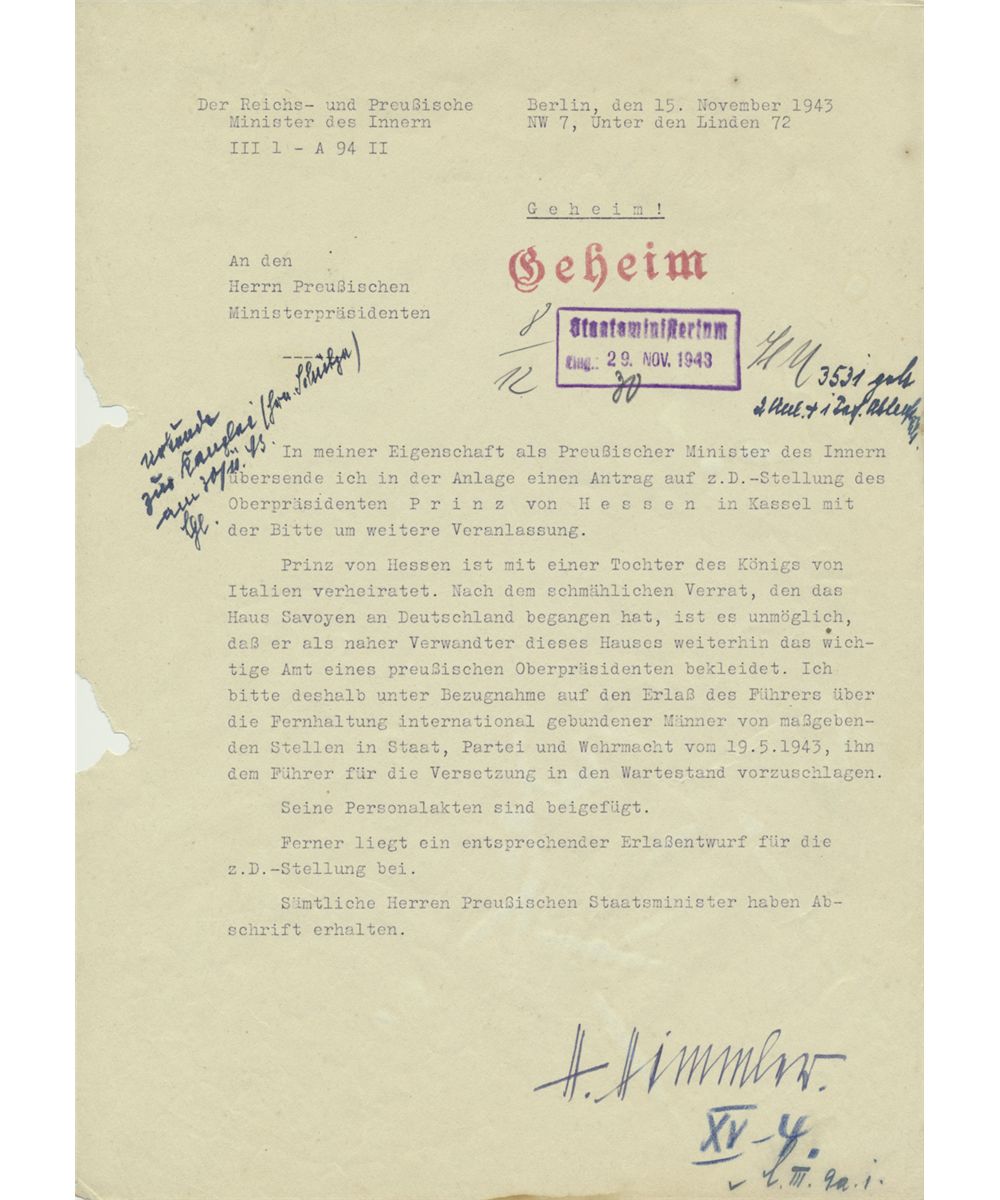 (1900 - 1945) Hitler's Chief of the Gestapo placed in charge of security and responsible for the construction and operation of extermination camps. He chose suicide rather than face a hangman's noose at Nuremberg. Typed D.S. in his capacity as Minister of the Interior, 1p. large 4to., Berlin, Nov. 15, 1943, stamped "Secret", to HERMANN GOERING in his capacity as Minister President of Prussia. In part: "...I am attaching a petition...the Prince [Philipp] von Hessen is married to a daughter of the King of Italy...after the disgraceful betrayal of the House of Savoy against Germany [Italy signed an armistice with the Allies on Sep. 8, 1943], it is impossible that he, as a close relative of the House, continues to have the important office of a Prussian Upper President. I therefore request...[per] the decree of the Fuhrer...to suggest to the Fuhrer that he be transferred into retirement...His personnel file is attached...". Docketed in several places, files holes, else very good. On 8 September 1943, Philipp was arrested on suspicion of espionage as he was married to the daughter of Italian King Victor Emanuele III. He was stripped of his membership in the party and sent to Flossenbuerg concentration camp where he was placed in solitary confinement. On 25 January 1944, his political disgrace became public when he was dismissed from his office as Governor of Hesse-Nassau. Philipp's wife Mafalda was arrested and eventually sent to Buchenwald where she was mortally wounded in a bombing raid.
