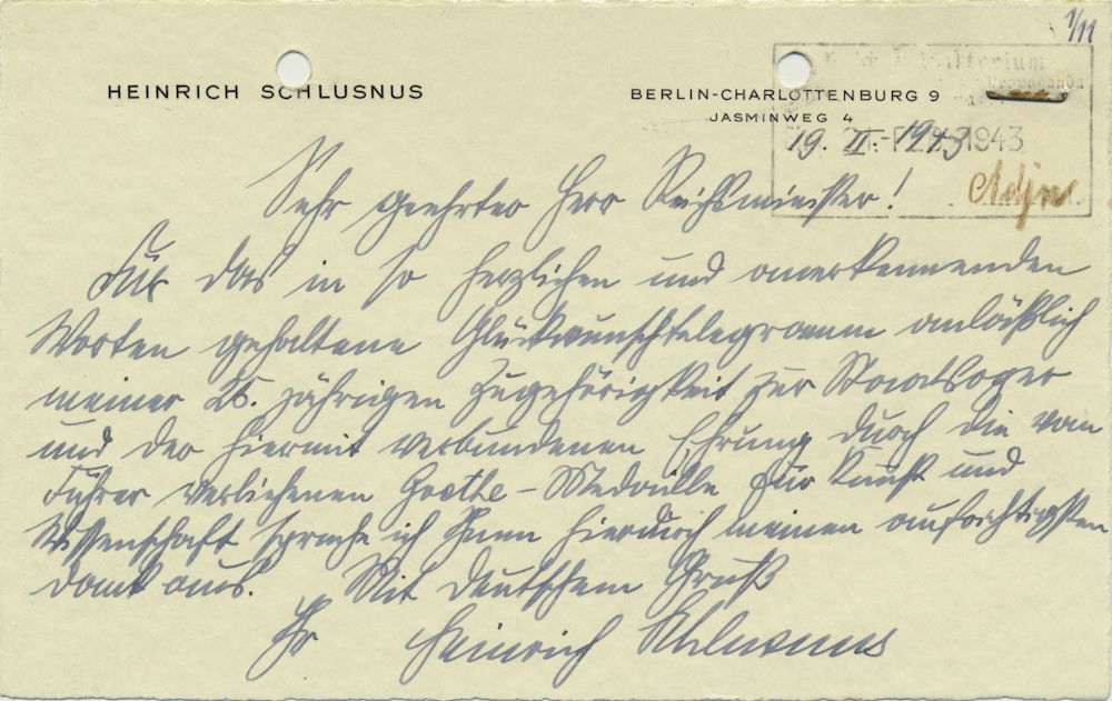 (1888 - 1952) Germany's foremost lyric baritone of the period between World War I and World War II. Fine association A.L.S. on his personal correspondence card, 1p. 12mo., Berlin, Feb. 19, 1943 to Minister of Propaganda JOSEPH GOEBBELS. He thanks Goebbels for sending congratulations upon the 25th anniversary of his membership in a Mozart organization. File holes and receiving stamp at top, else very good.