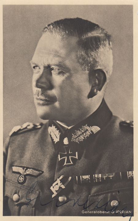 (d. 1953) German general and Hitler's Army Chief of Staff, the inventor of the "blitzkrieg" who commanded panzers in the Poland and France, and the Russian campaign. War-date S.P. 3 1/2" x 5 1/2" b/w, a chest, up pose by Hoffmann, nicely signed at bottom. Period inscription on verso indicates this item was signed during the war. Very, very light surface crease, else fine.