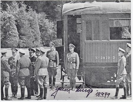 (1913 - 1980) SS officer and personal valet to Adolf Hitler. He assisted with the cremation of the corpses of Hitler and Eva Braun. S.P. 6 1/4" x 4 3/4" b/w printed photo of Hitler meeting with fellow officers after the signing of the French surrender aboard the same rail car on which the 1918 armistice ending the First World War was signed. Fine condition.